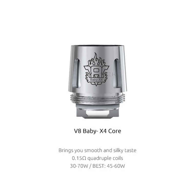 Der neue SMOK V8 Baby-X4 Quadruple Coil mit 0.15 Ohm Widerstand sorgt für eine enorme Dampfentwicklung und wurde von SMOK optimiert, um eine sehr gute Geschmacksentfaltung im SUB OHM Betrieb zu gewährleisten.