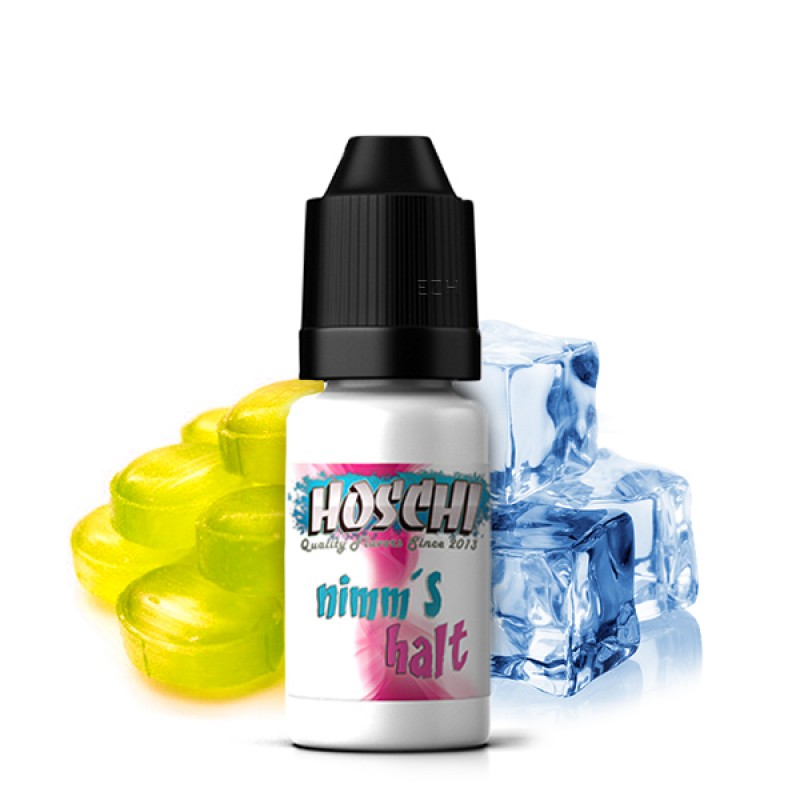 Das Hoschi Nimms Halt Aroma vereint den Geschmack zweier sehr beliebter Zitronenbonbons in einem Aroma: die bekannten Fruchtbonbons mit flüssigem Kern, die es mit Orange und Zitrone gibt und die frischen Zitronen-Hustenbonbons, die jeder kennt.
