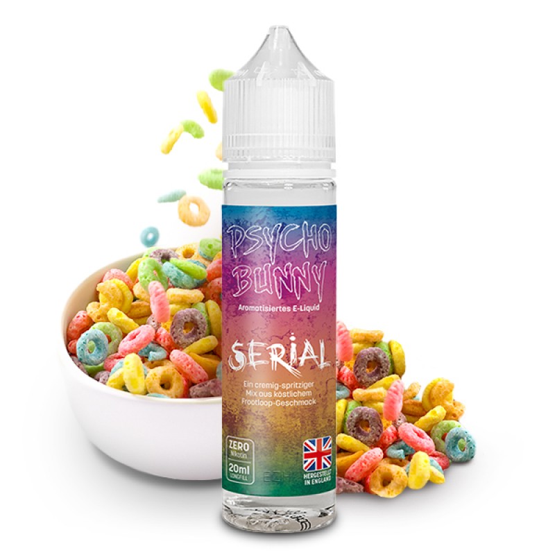 Der wahnsinnig gewordene Hase aus Großbritannien präsentiert Dir mit "Serial" ein explosives Frühstückshighlight, direkt im Tank Deiner E-Zigarette. Wohl jeder von uns kennt die bunten Cerealien-Loops mit ihrem köstlichen Geschmack nach Getreide und Früchten sowie den ausgewogenen, süßen und auch dezent säuerlichen Fruchtnoten. Den Aromaspezialisten des Psycho Bunny ist es gelungen, dieses Cerealien-Highlight authentisch und intensiv in einem Aroma einzufangen. Zusammen mit einer cremig-weichen und vollmundigen Milch in einer großen Schüssel serviert, mutiert "Serial" zu einer absoluten Geschmackssensation, die Cerealien-Fans und Freunde fruchtig-süßer Aromen gleichermaßen begeistern wird. Mit diesem "Frühstück" kann der Tag einfach nur gut werden!